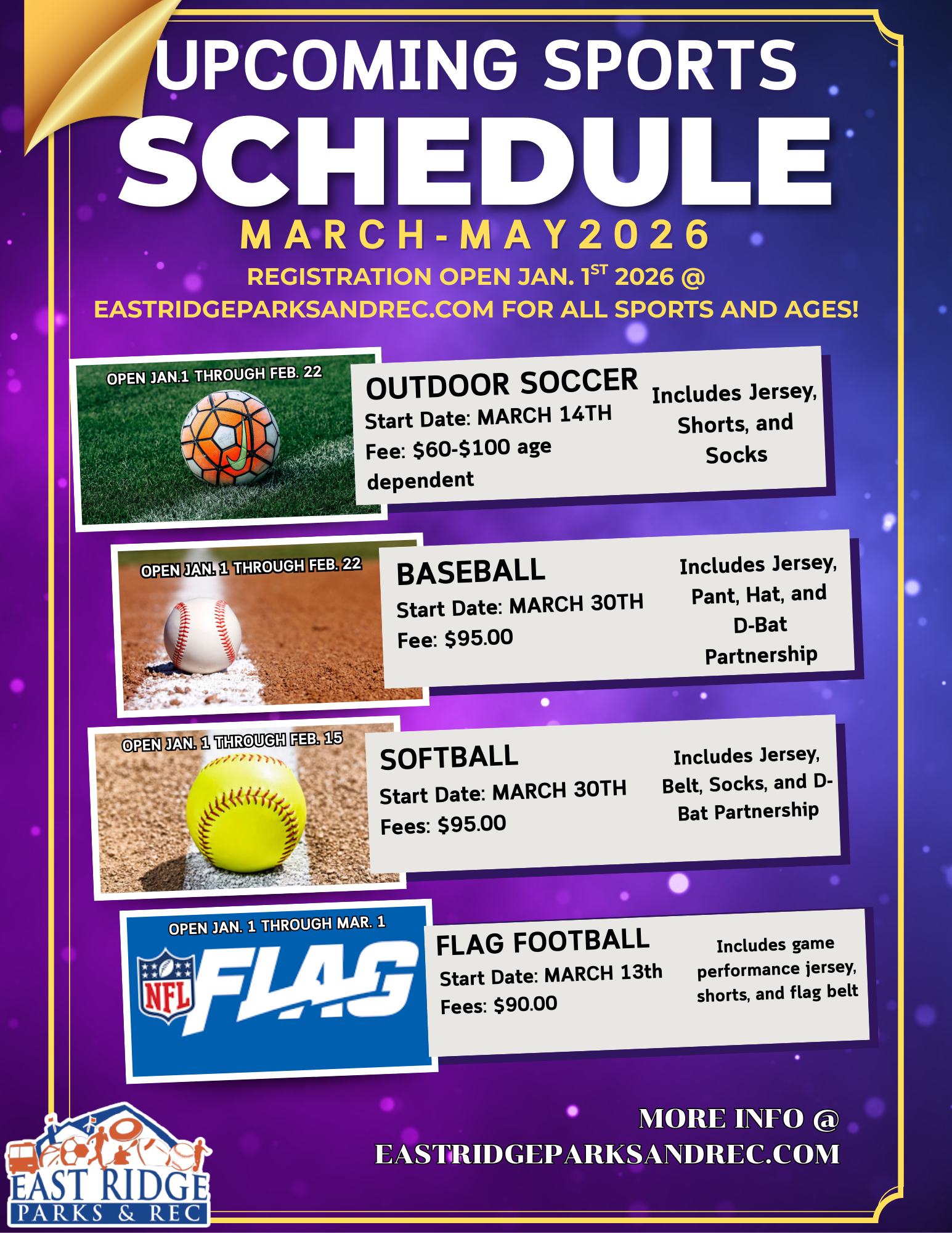 These fine businesses make what we do possible. Please show your support for these amazing sponsors and thank them for their commitment to East Ridge Parks and Recreation.